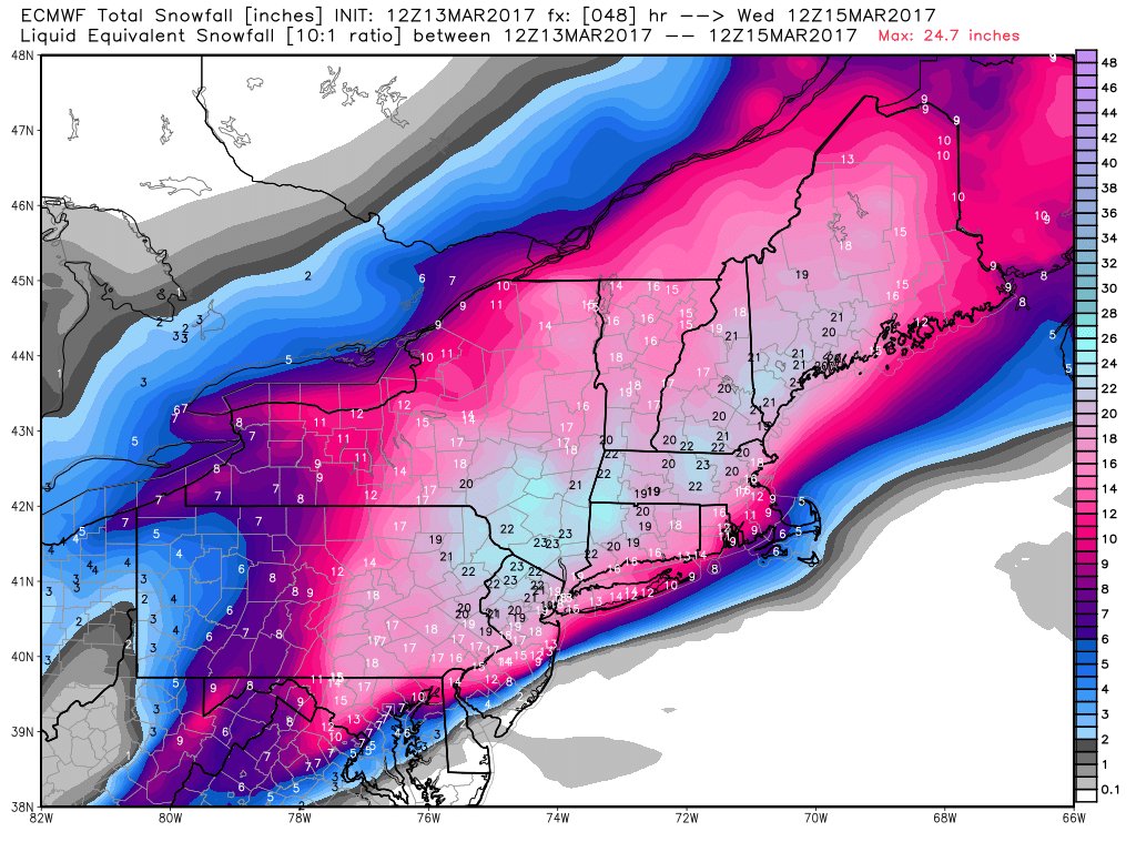 And our storm is going to explode on the East Coast. It’s not quite “March 1993 Superstorm” level but it’s still very impressive. The entire NJ/NY/CT/New York City area is under a Blizzard Warning – winds could easily hit 60-70 mph in Manhattan with over a foot of snow. DC might get “missed” with 3-6” of slushy mix, but things escalate just to the north and west with a band of 10-inch to two-foot snow totals likely throughout the NE corridor and New England. Even if any of several factors cut the snow totals slightly the incredible strong winds are a lock and will leave quite an impression.