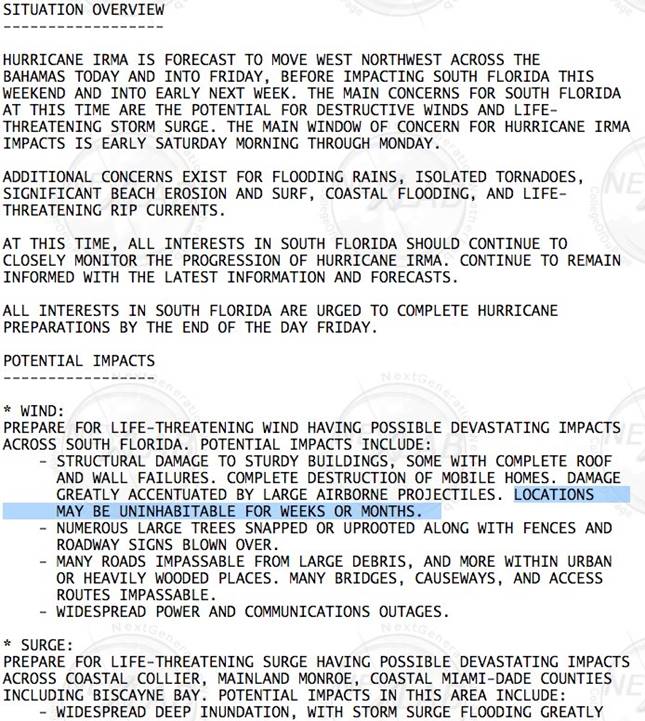 Here is an update on Hurricane Irma – there is good news and there is bad news, but it is mostly bad news. This is a very serious storm and it’s going to take a lot of luck to avoid a major disaster in Florida. The odds now favor this storm joining Andrew, Camille, Katrina, Harvey and others among the most infamous hurricanes in American history. There is still time for luck to come out on our side, but there is precious little time left to prepare for a potential catastrophe.